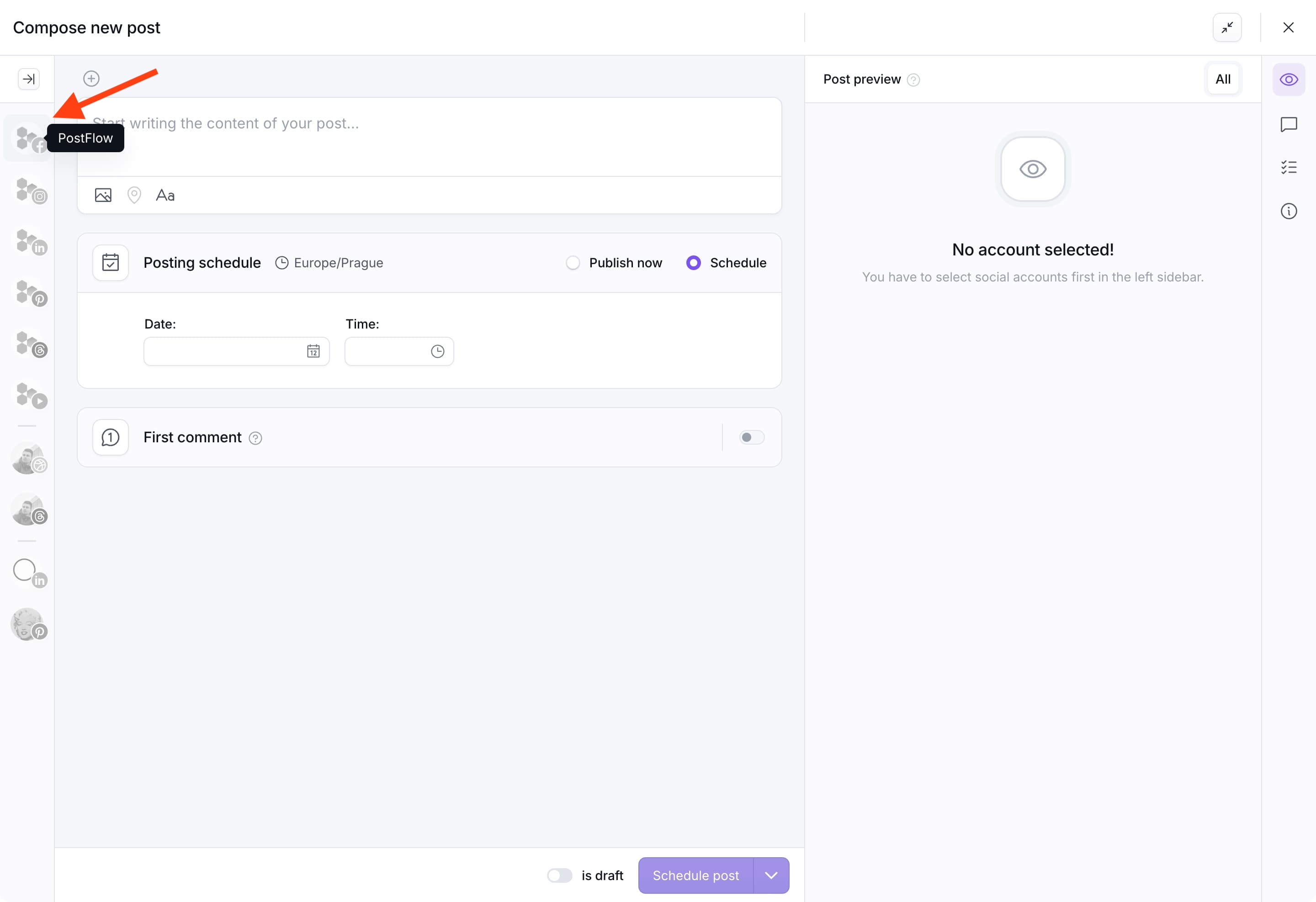 Create new postbutton in left sidebar menu. - Once the composer opens, select your Facebook account on the left by clicking on its avatar.