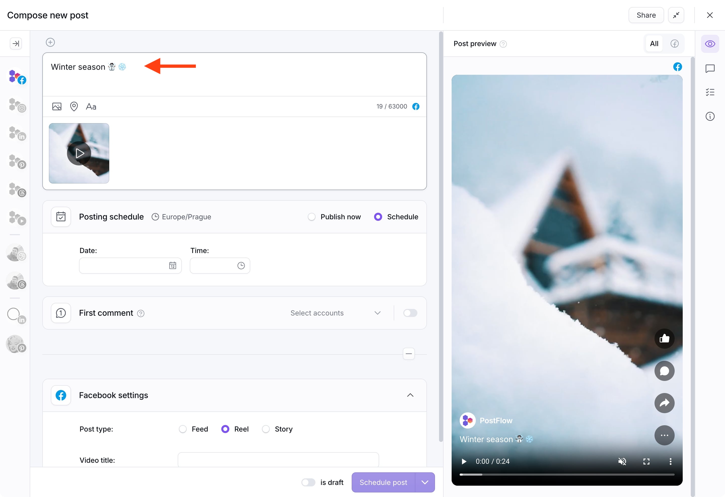 With PostFlow, you can easily plan and schedule your Facebook Reels in advance, saving you precious time. Let's take a look how.